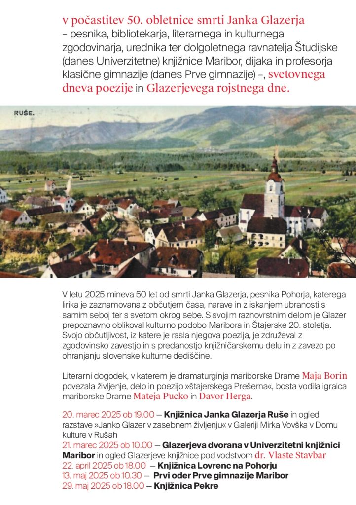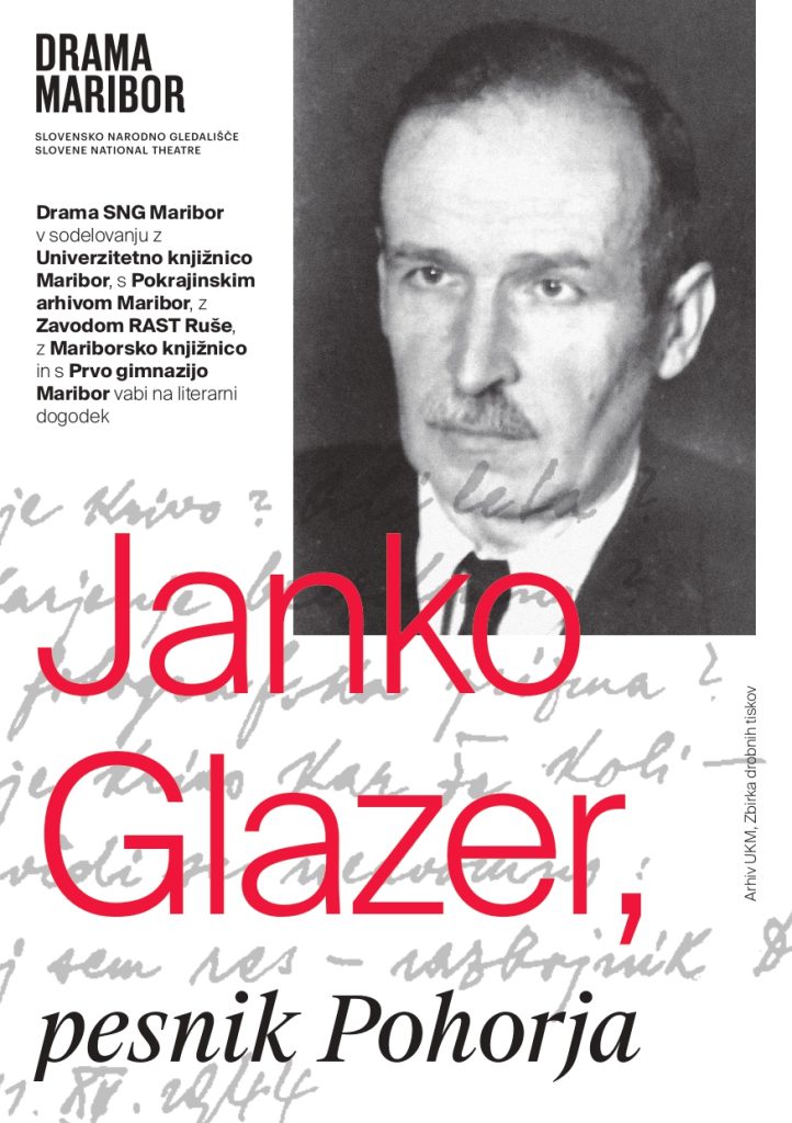 V sodelovanju z Dramo SNG Maribor, Univerzitetno knjižnico Maribor, Pokrajinskim arhivom Maribor, Mariborsko knjižnico in Prvo gimnazijo Maribor vas, v počastitev 50. obletnice smrti Janka Glazerja, vabimo na literarni dogodek “Janko Glazer, pesnik Pohorja”.