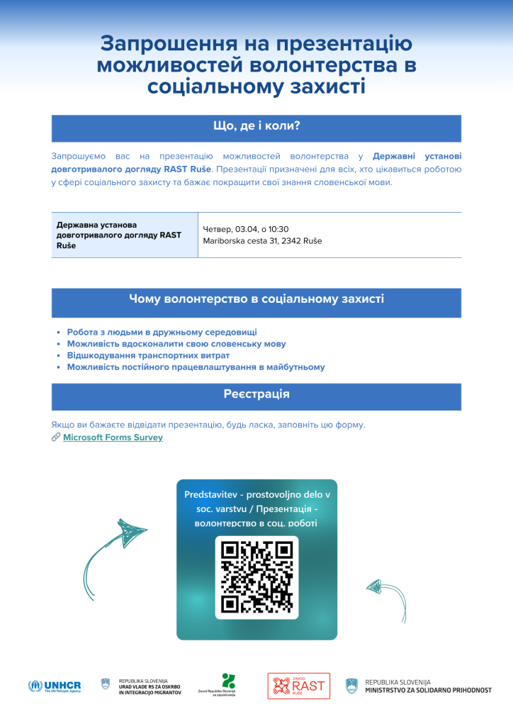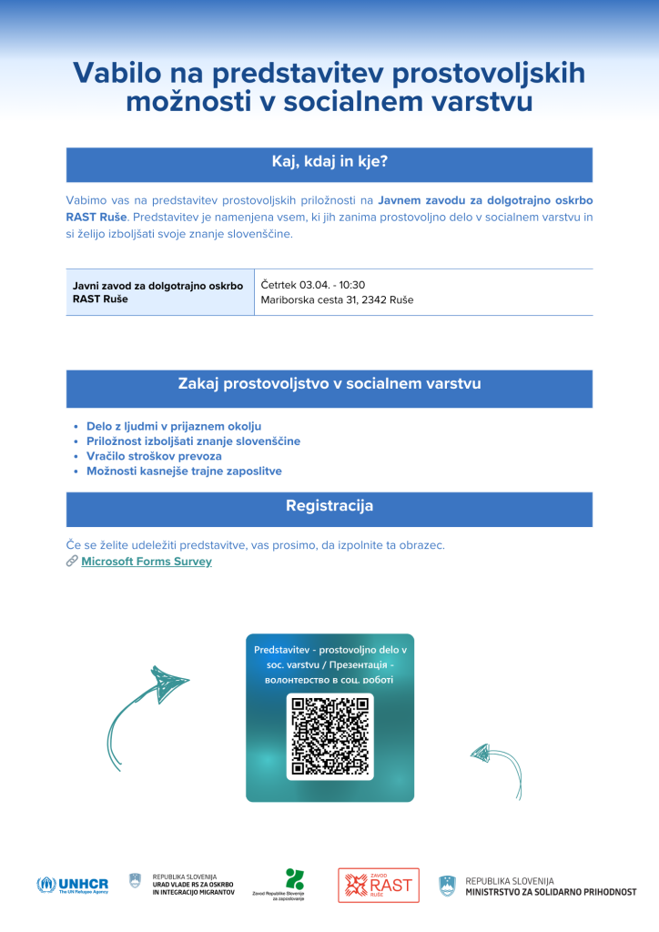 Vabljeni na predstavitev prostovoljskih možnosti v socialnem varstvu. https://forms.office.com/e/MD9bSnJxt1
